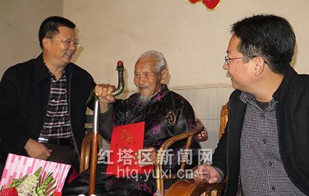 11月26日,红塔区民政局等相关部门负责人来到刘家熬老人家中,向老人献上鲜花、蛋糕,并颁发证书。